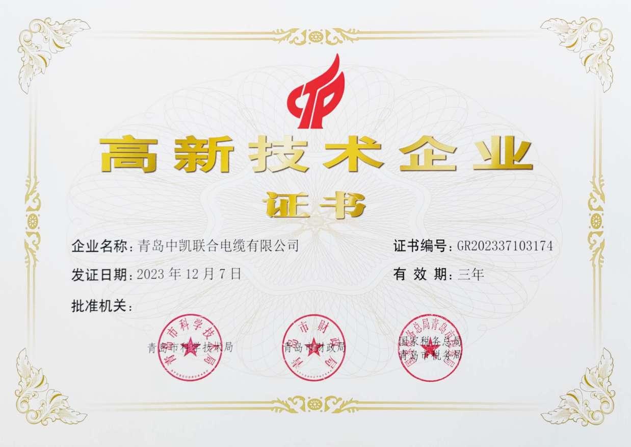 2023-03-05青岛中凯联合电缆有限公司凭借研发创新、成果转化等综合实力于2020年12月1日顺利通过高新技术企业认定。“高新技术企业”属于国家重点支持的具有高成长性的创新型企业,也是重要的资质认证,更是企业竞争实力的重要标志。此次获得高新技术企业认定,不仅代表着对我公司核心自主研发能力、科技成果与转化能力和研发组 -